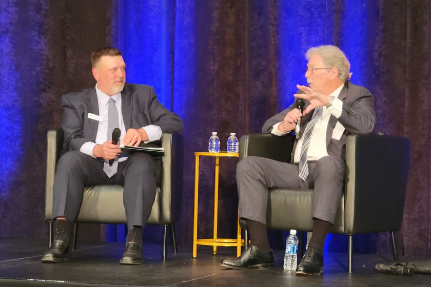 Photo: Greater North Dakota Chamber CEO and President Arik Spencer (left) speaks with David Alexander, President of General Atomics Aeronautical Systems, at a Future Forum event Tuesday, June 4, 2024. – Grand Forks Herald